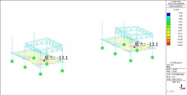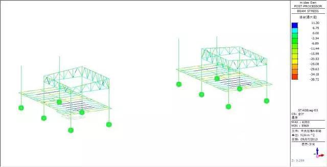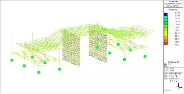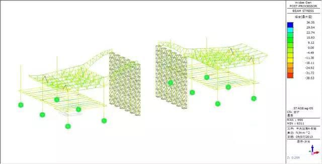 Force and transformation analyze: max vertical transformation 13.1mm, appears in the beam, nearly no transformation to the truss, max force of the bar member is 38.72MPa.