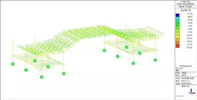 Force and transformation analyze: max vertical transformation 13.05mm, appear at the beam, small vertical transformation; max internal force 38.53MPa.