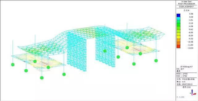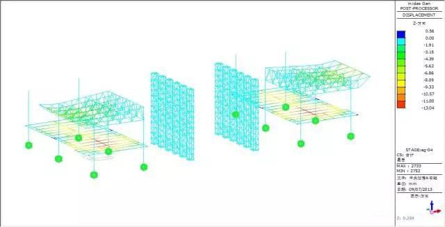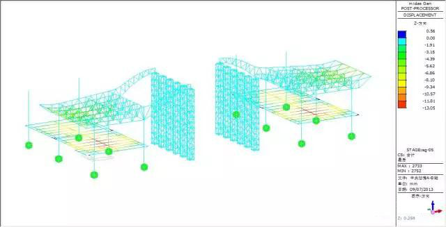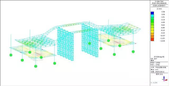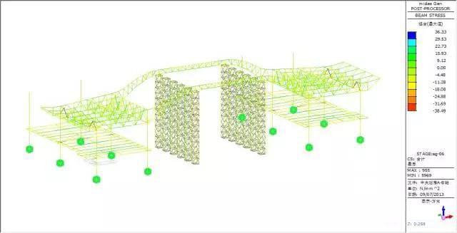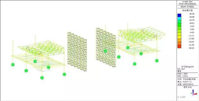 Force and transformation analyze: max vertical transformation 13.04mm, appear at the beam, the vertical transformation of the truss is small, the max force inside of the bar member is 38.23MPa.